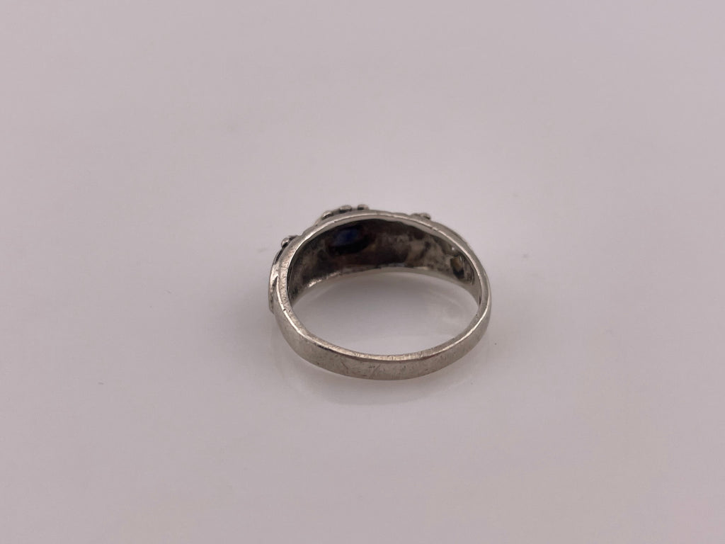 The silver is scratched from wear and storage, as is typical with pre-owned jewelry. This ring has tarnishing and patina that may not come off when polished.