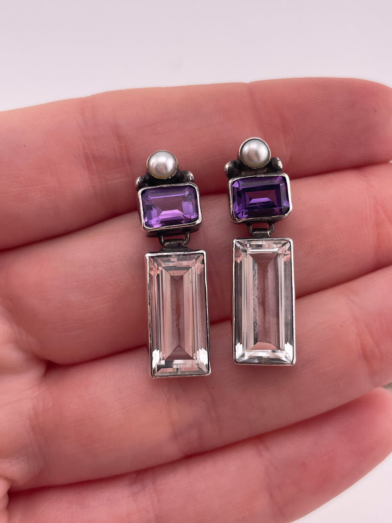 sterling silver faceted quartz amethyst pearl post hinge earrings