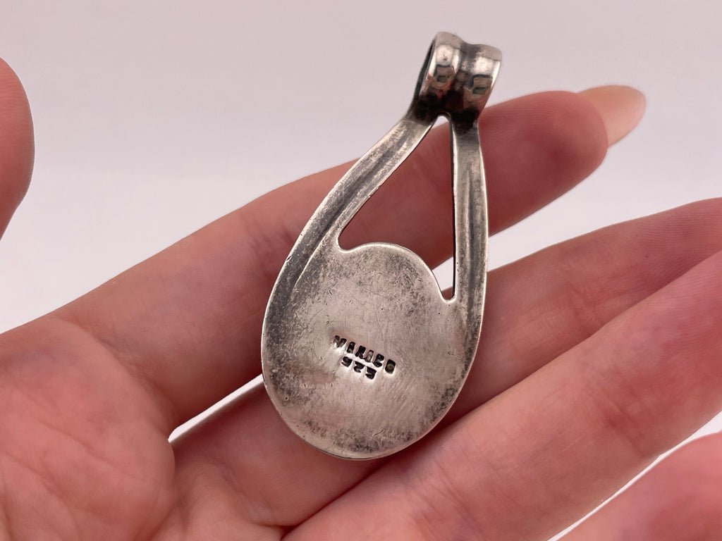 This pendant has scratches to the silver from previous wear, and tarnishing that may not come off when polished.