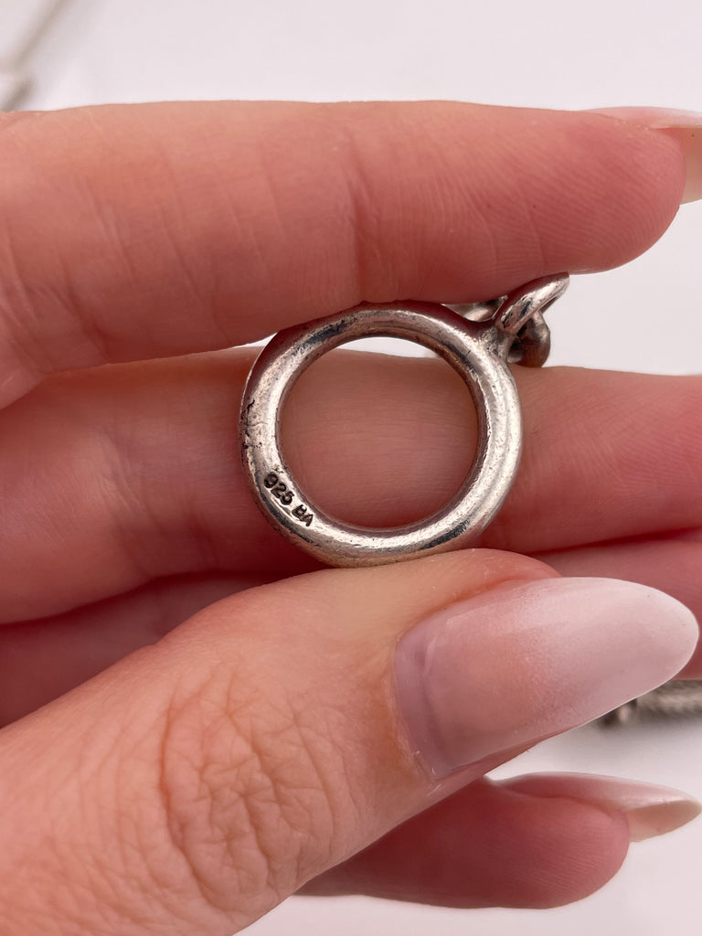 The silver is scratched from wear and storage, as is typical with pre-owned jewelry. This ring has tarnishing and patina that may not come off when polished.