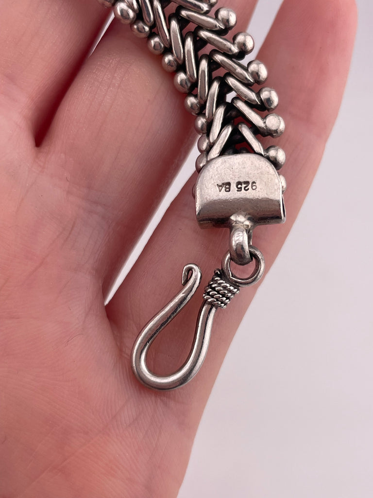 The silver is scratched from wear and storage, as is typical with pre-owned jewelry. This jewelry has tarnishing and patina that may not come off when polished. One of the connecting links is slightly out of shape causing a uneven gap between links. This is not noticeable when worn.