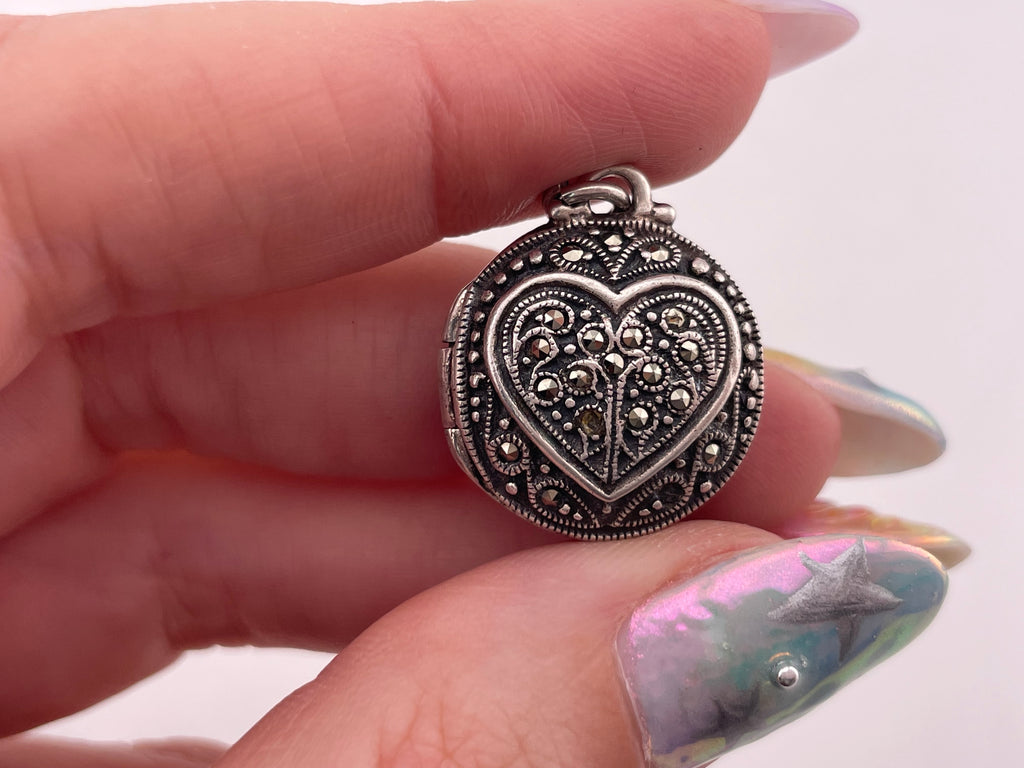 sterling silver marcasite mother of pearl heart round locket pendant ***Missing Marcasite***