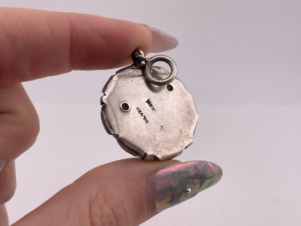 This pendant has scratches to the silver from previous wear, and tarnishing that may not come off when polished.