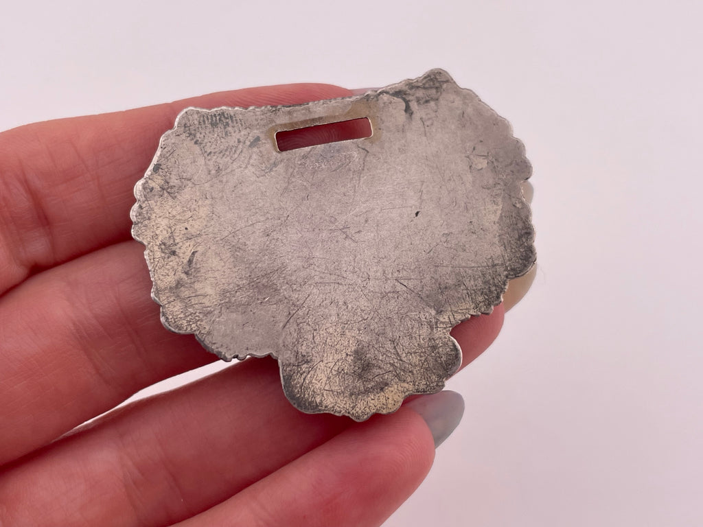This pendant/tag has scratches to the silver from previous wear, and tarnishing that may not come off when polished.
