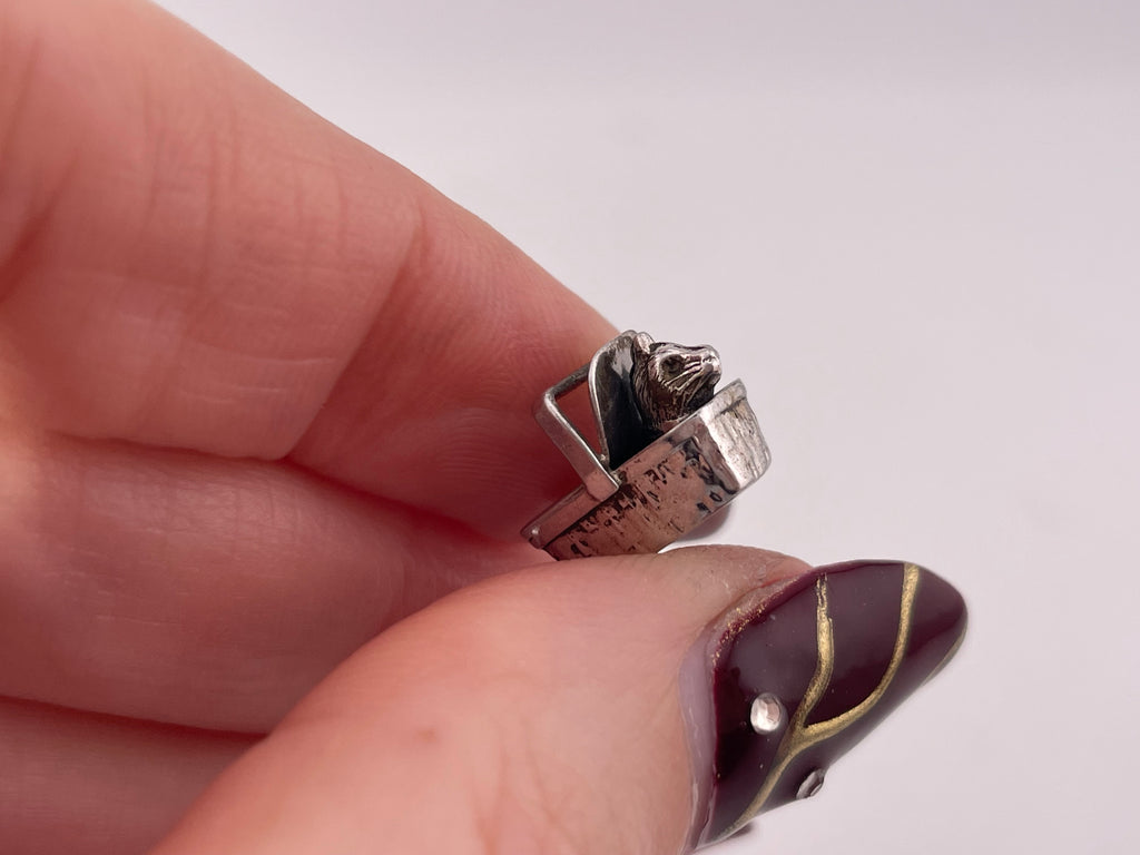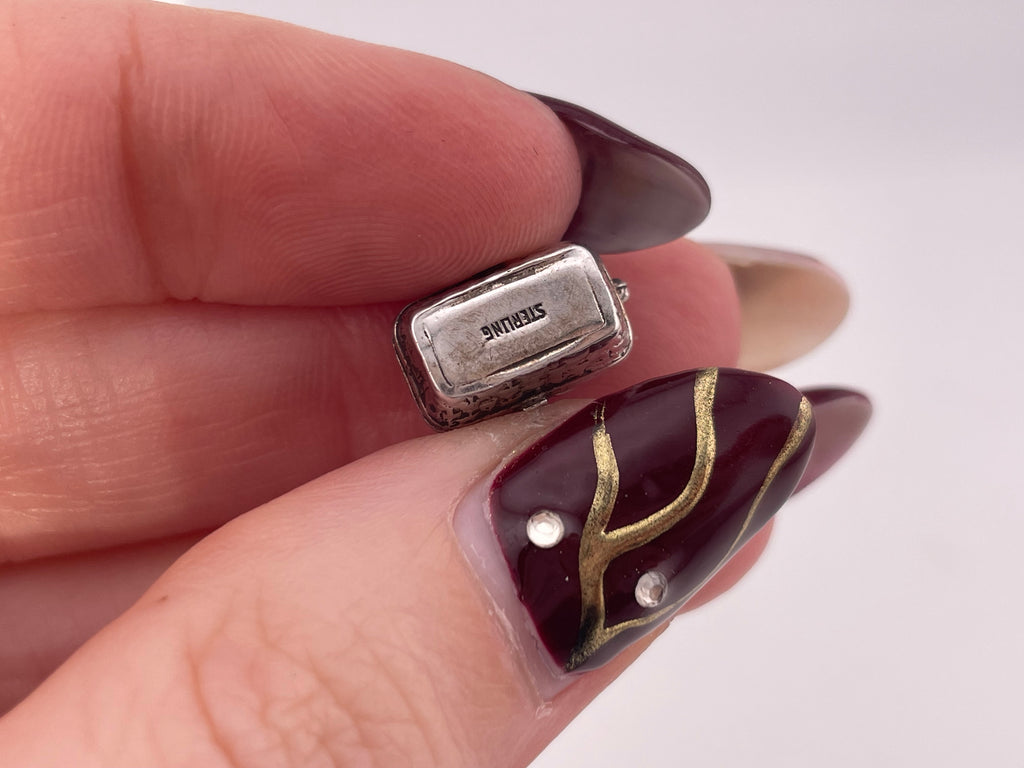 This pendant has scratches to the silver from previous wear, and tarnishing that may not come off when polished. A chain will go through the handle of the basket.
