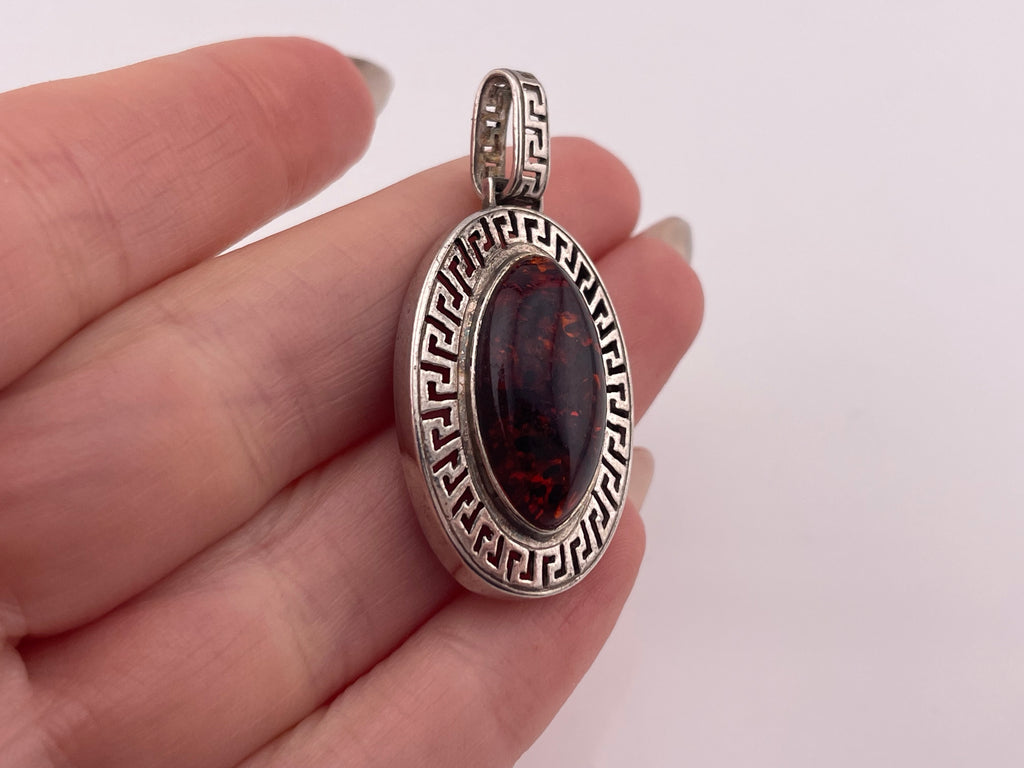 sterling silver synthetic amber Greek Key design pendant