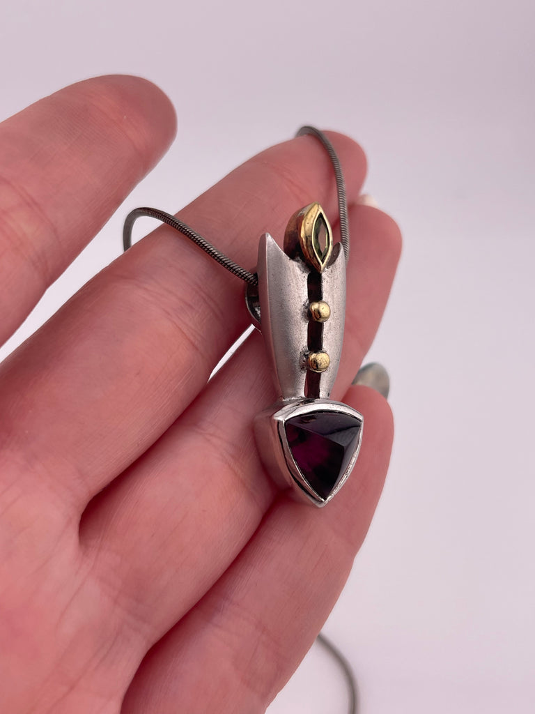 sterling silver & gold plated faceted garnet & peridot matte finish necklace