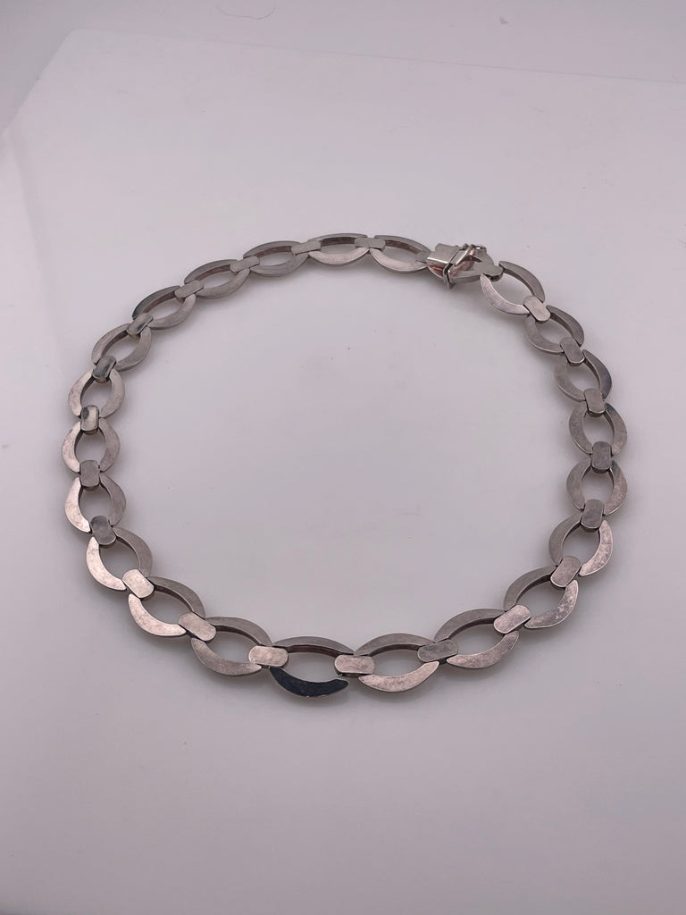 This has scratches to the silver from previous wear, and tarnishing that may not come off when polished. There are small marks on the links from previous wear and from production.