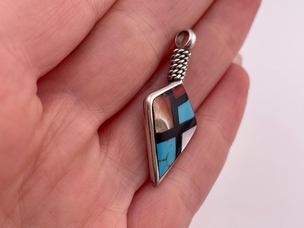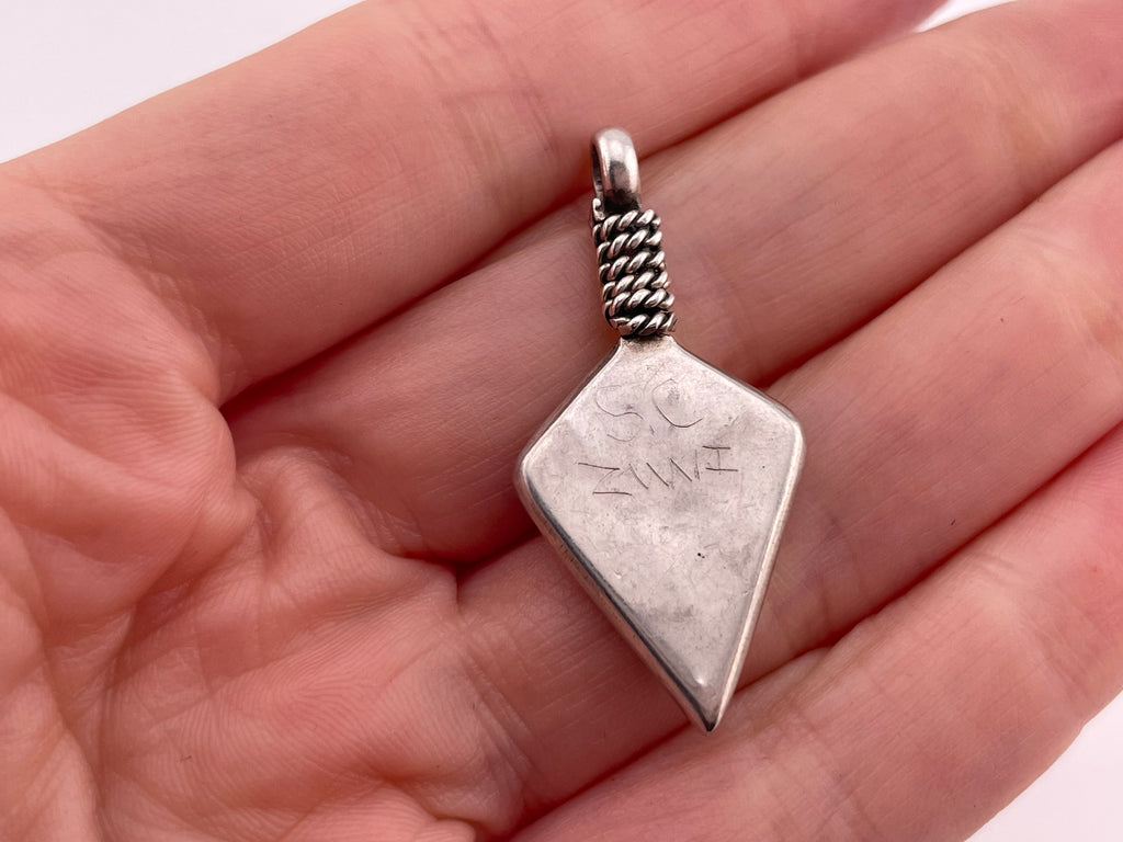This pendant has scratches to the silver from previous wear, and tarnishing that may not come off when polished.