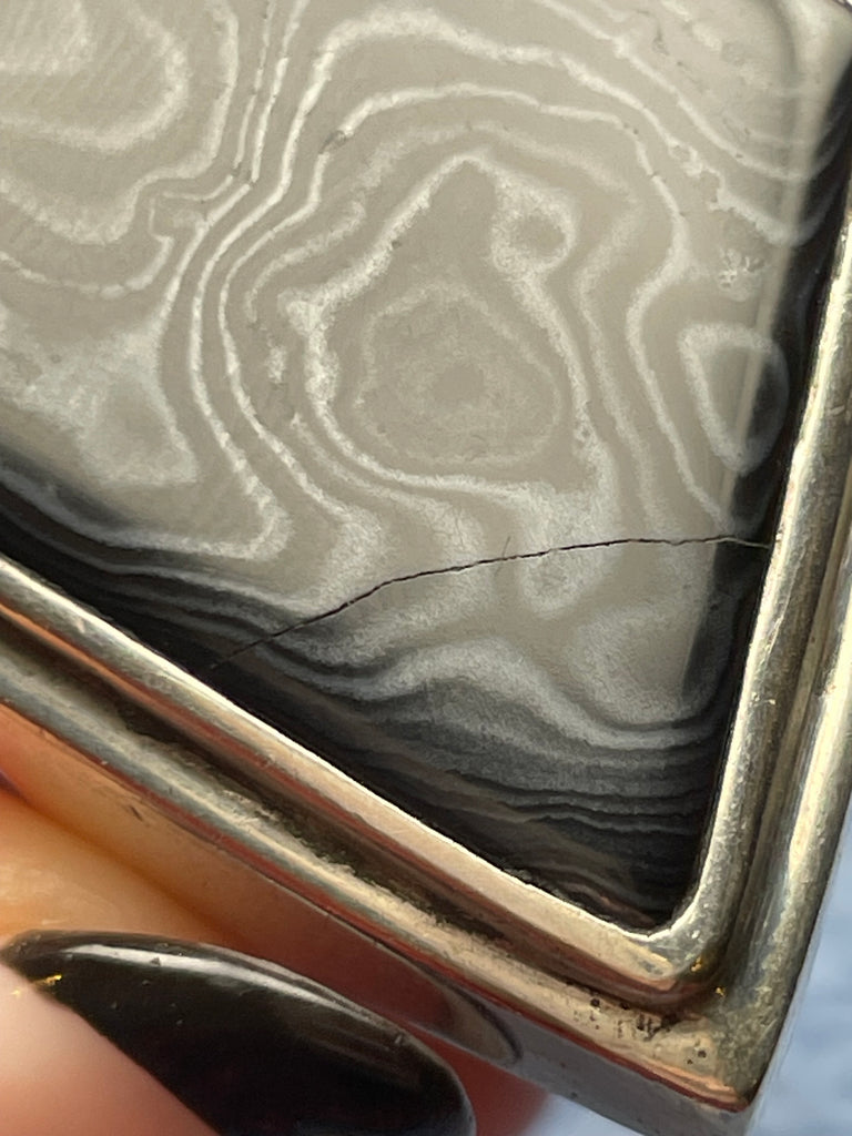 Please note that there is a hairline crack in the stone - see photos. There are some deep nicks to the silver.