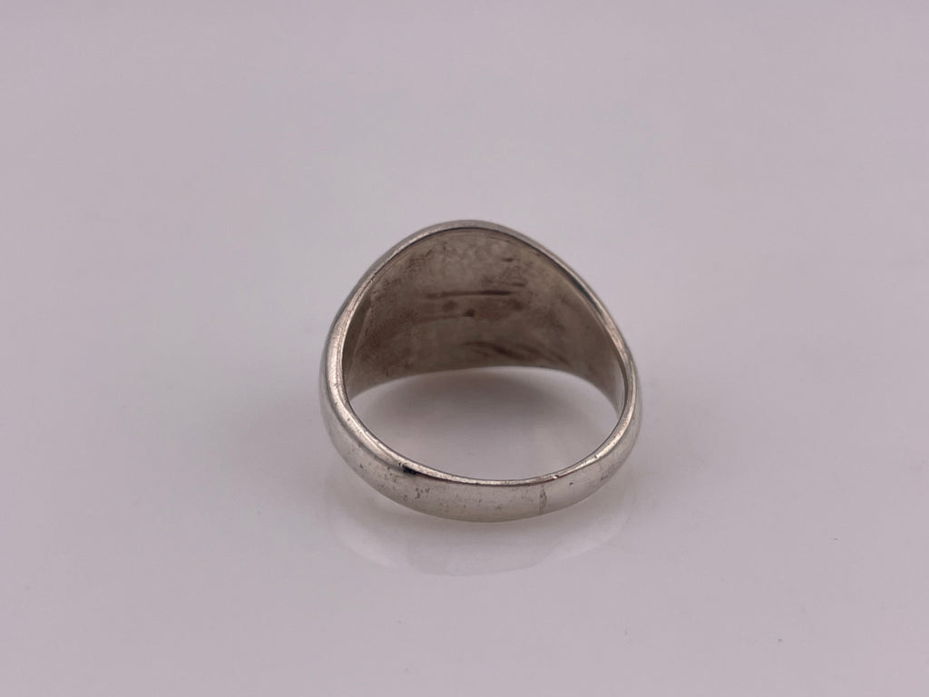 The silver is scratched from wear and storage, as is typical with pre-owned jewelry. This ring has tarnishing and patina that may not come off when polished.