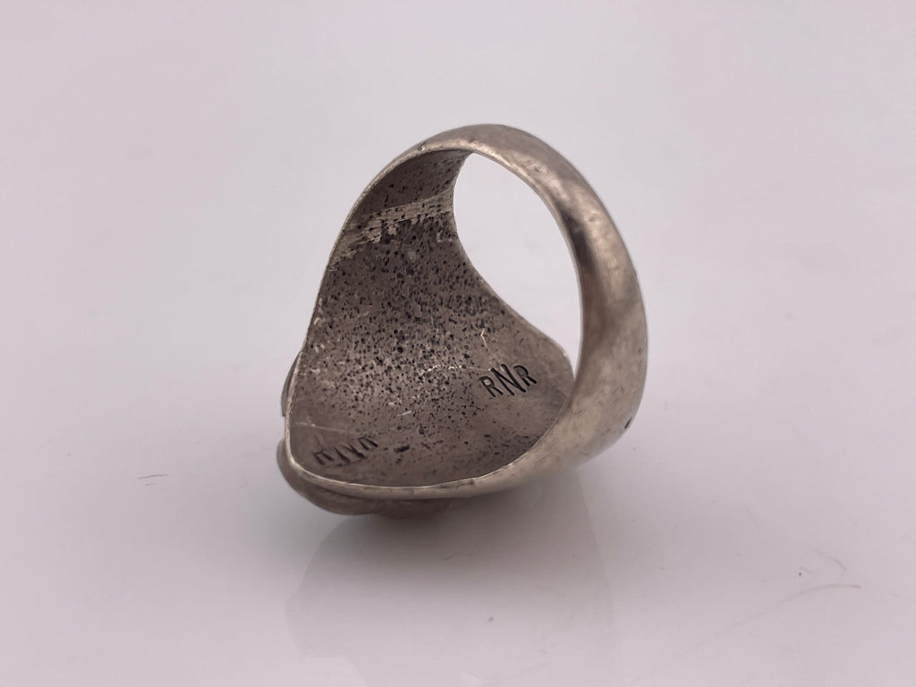 The silver is scratched from wear and storage, as is typical with pre-owned jewelry. This ring has tarnishing and patina that may not come off when polished. There are several noticeable dents and scratches from previous wear.