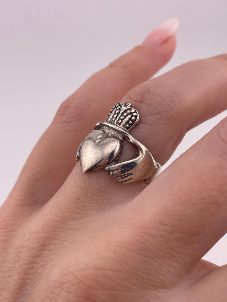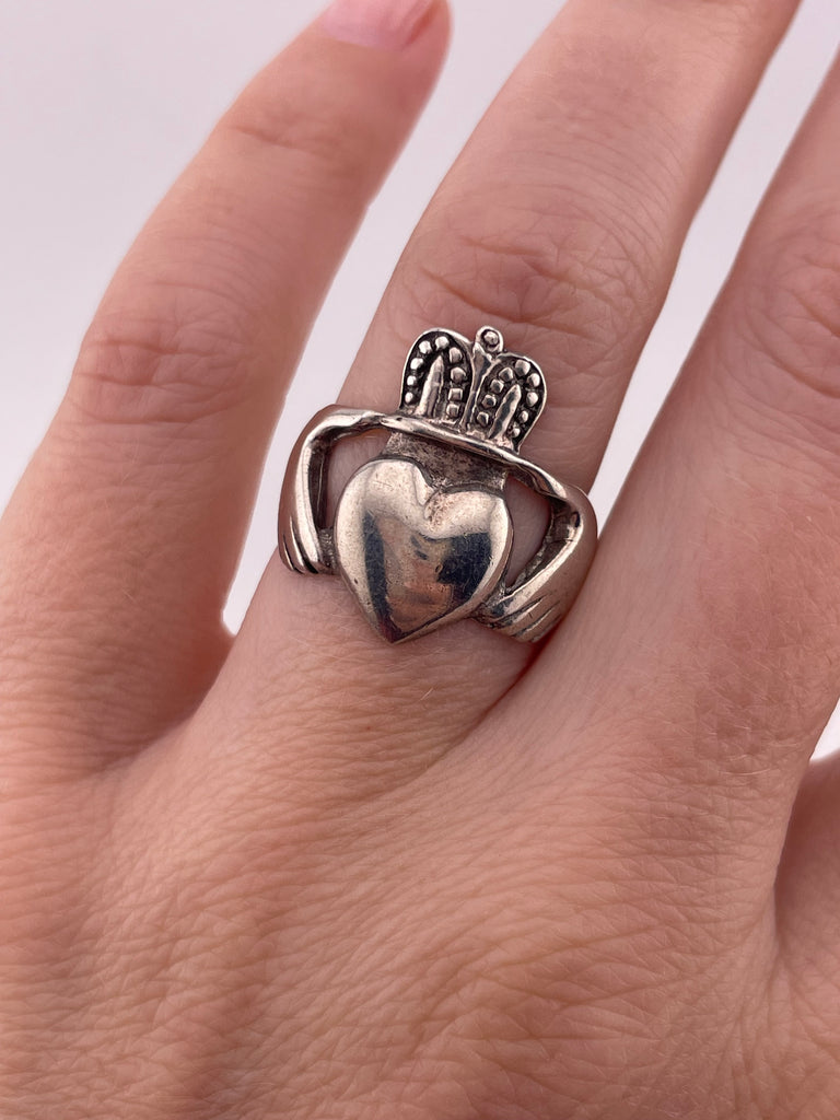 The silver is scratched from wear and storage, as is typical with pre-owned jewelry. This ring has tarnishing and patina that may not come off when polished.