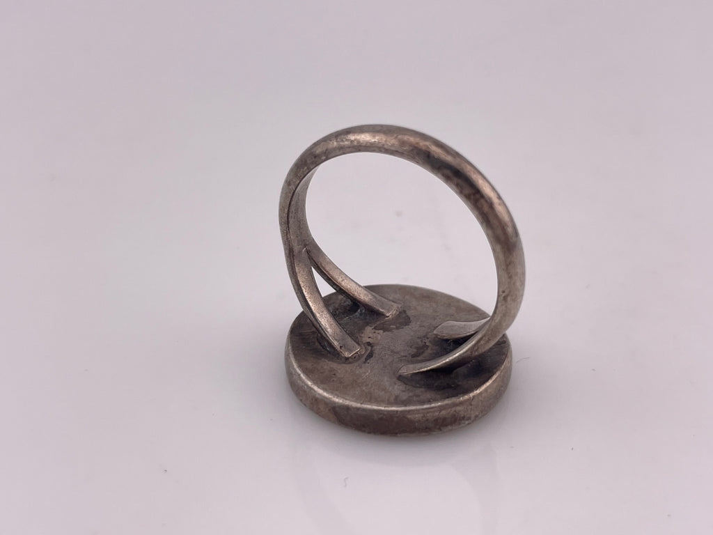The silver is scratched from wear and storage, as is typical with pre-owned jewelry. This ring has tarnishing and patina that may not come off when polished.