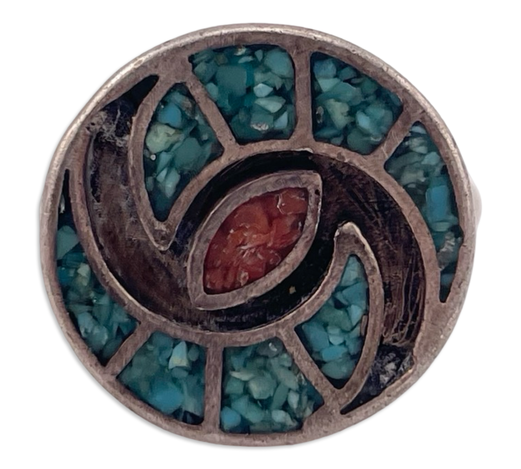size 7.5 sterling silver crushed turquoise coral hummingbird pattern ring