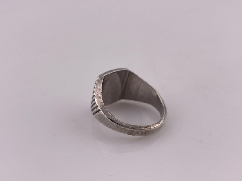 The silver is scratched from wear and storage, as is typical with pre-owned jewelry. This ring has tarnishing and patina that may not come off when polished.