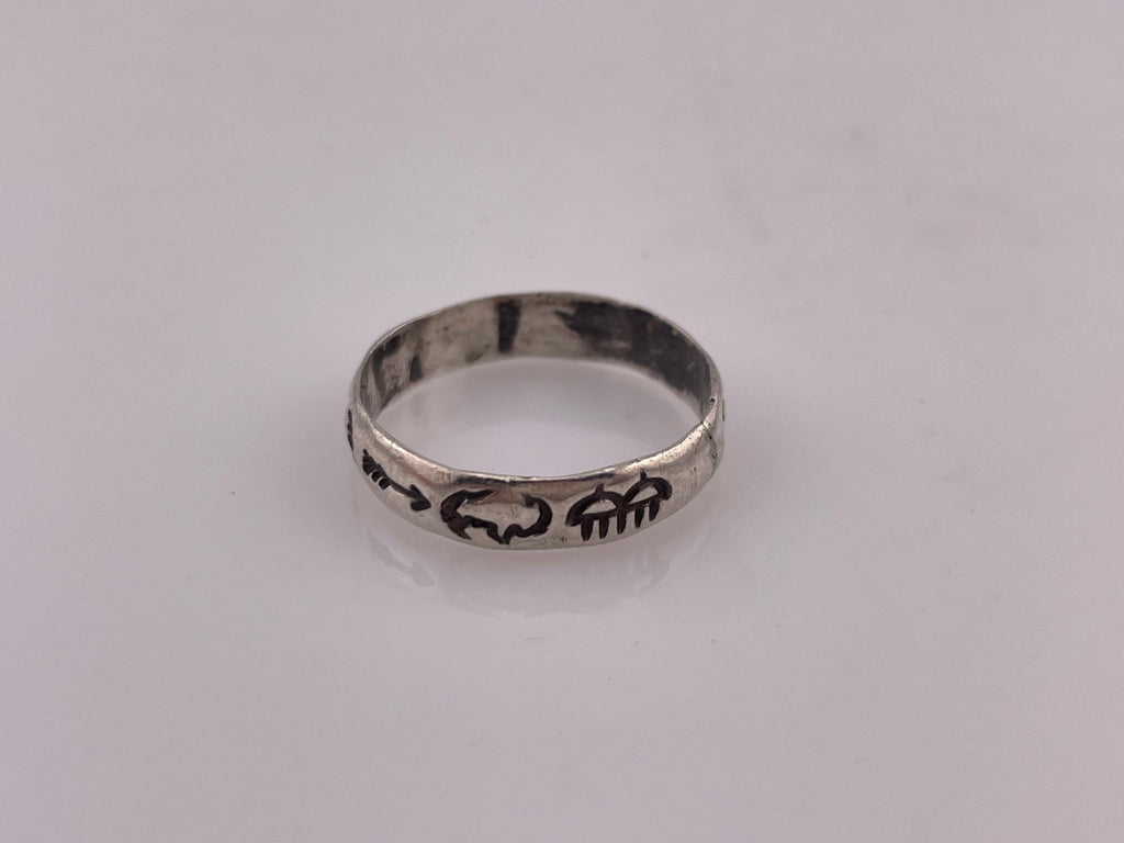 The silver is scratched from wear and storage, as is typical with pre-owned jewelry. This ring has tarnishing and patina that may not come off when polished. A non-sterling solder was used causing a yellow tarnishing on the inside of the band.