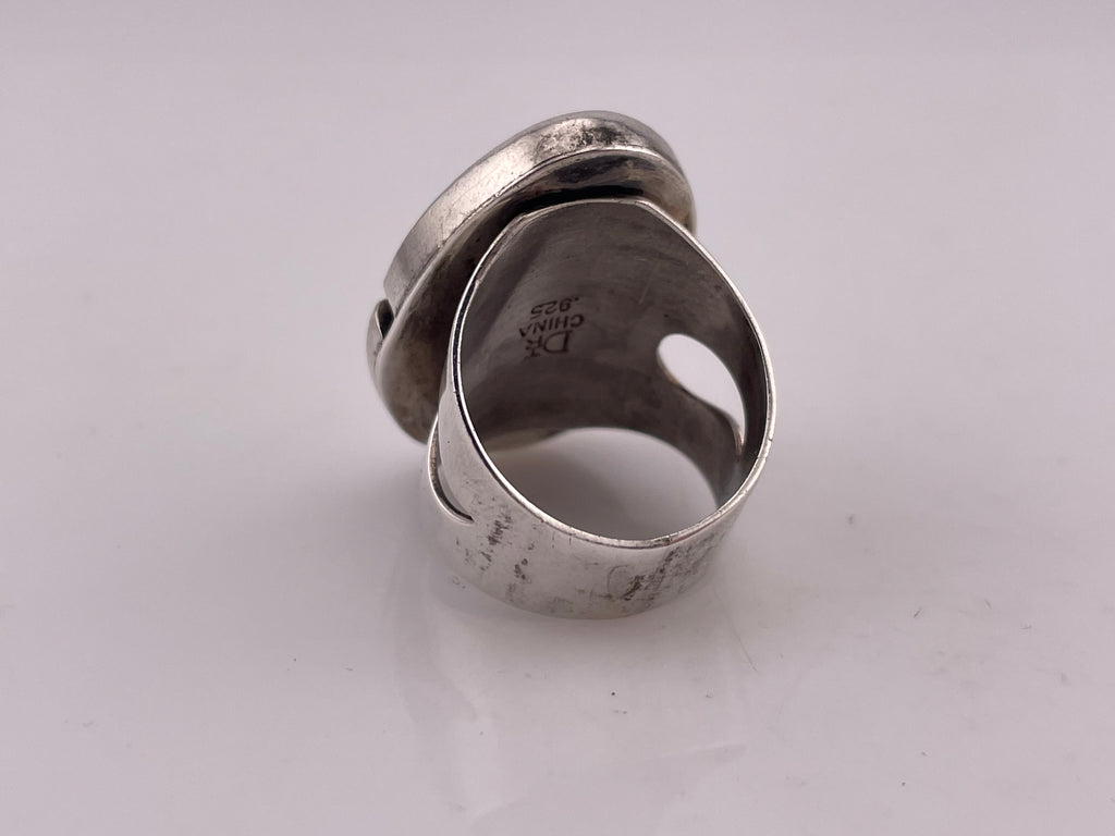 The silver is scratched from wear and storage, as is typical with pre-owned jewelry. This ring has tarnishing and patina that may not come off when polished. The stone is dry and dull from wear and age!