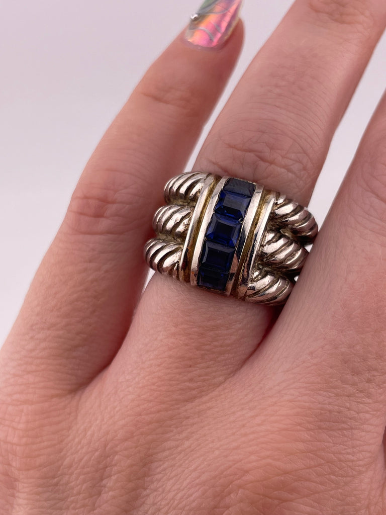 The silver is scratched from wear and storage, as is typical with pre-owned jewelry. This ring has tarnishing and patina that may not come off when polished.