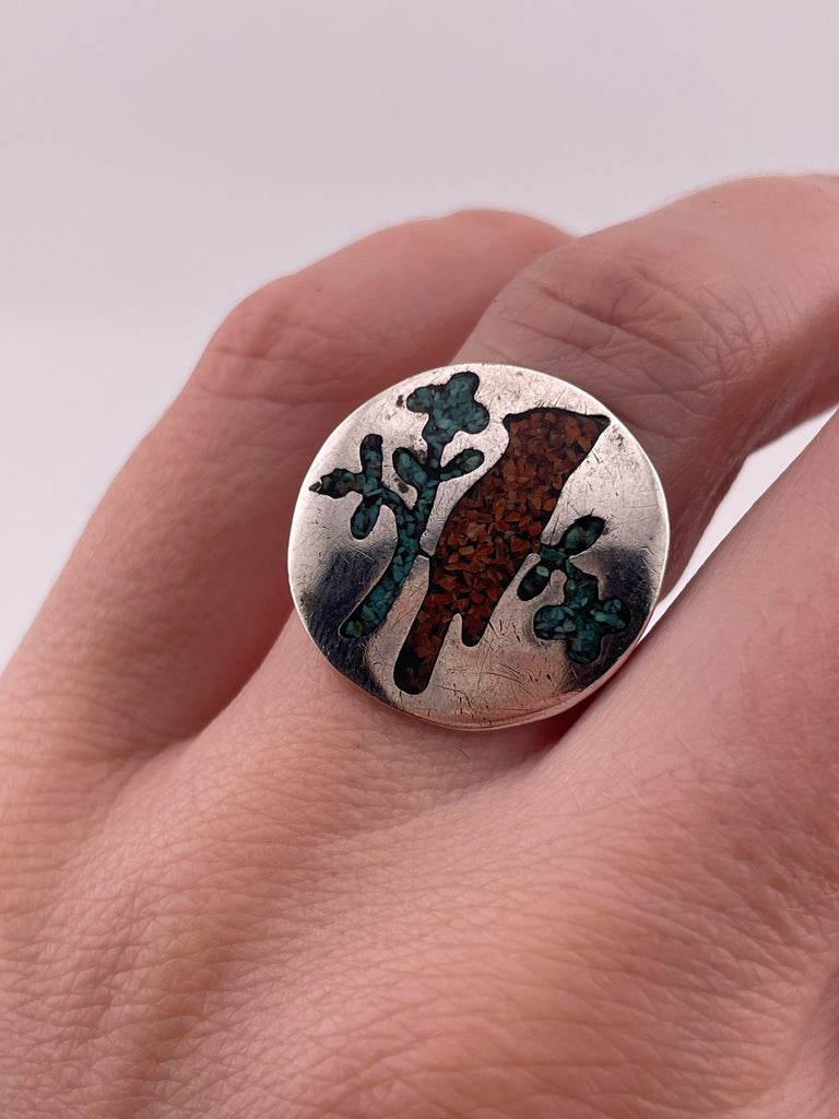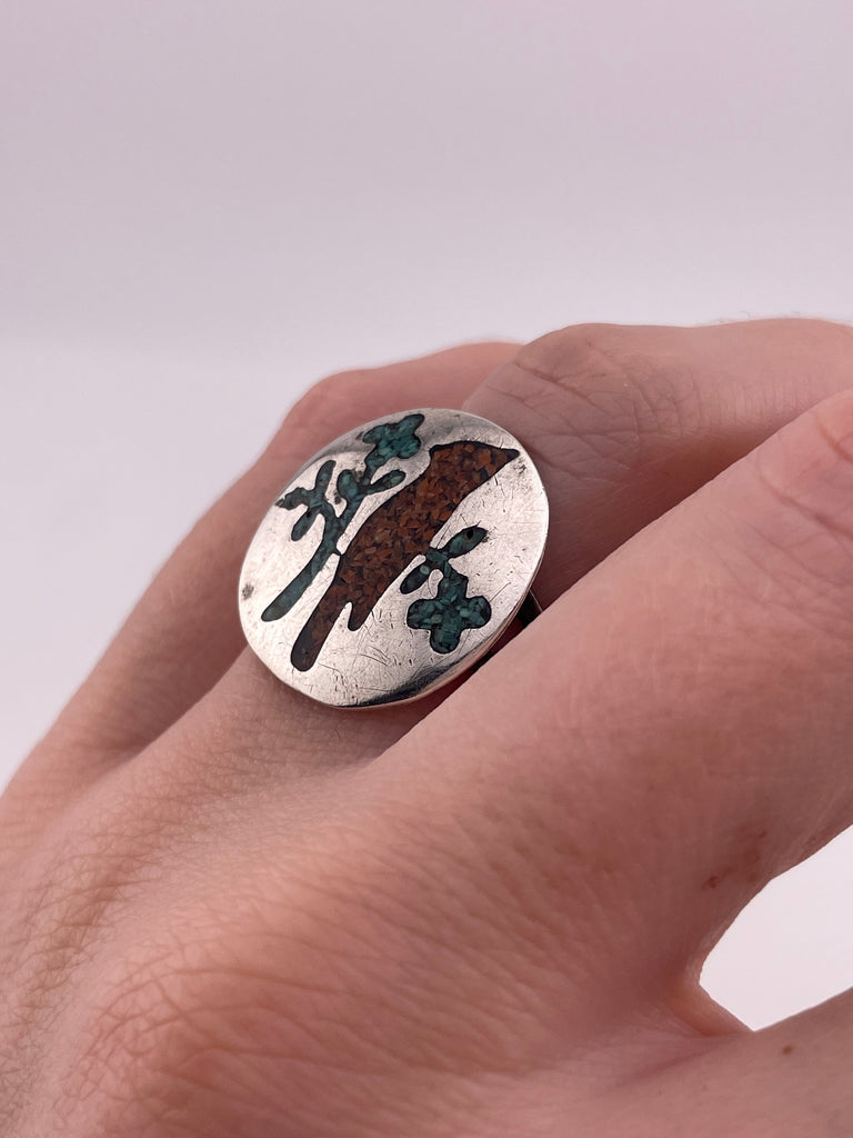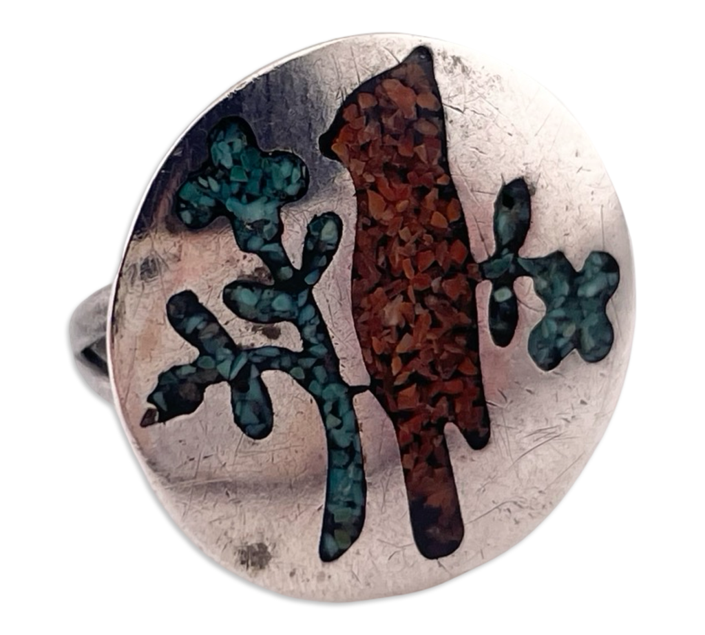 size 6.5 sterling silver crushed turquoise coral cardinal bird ring