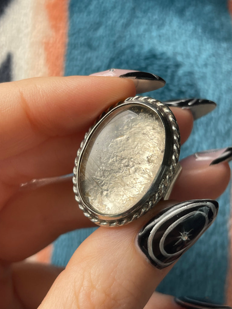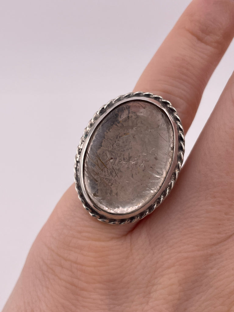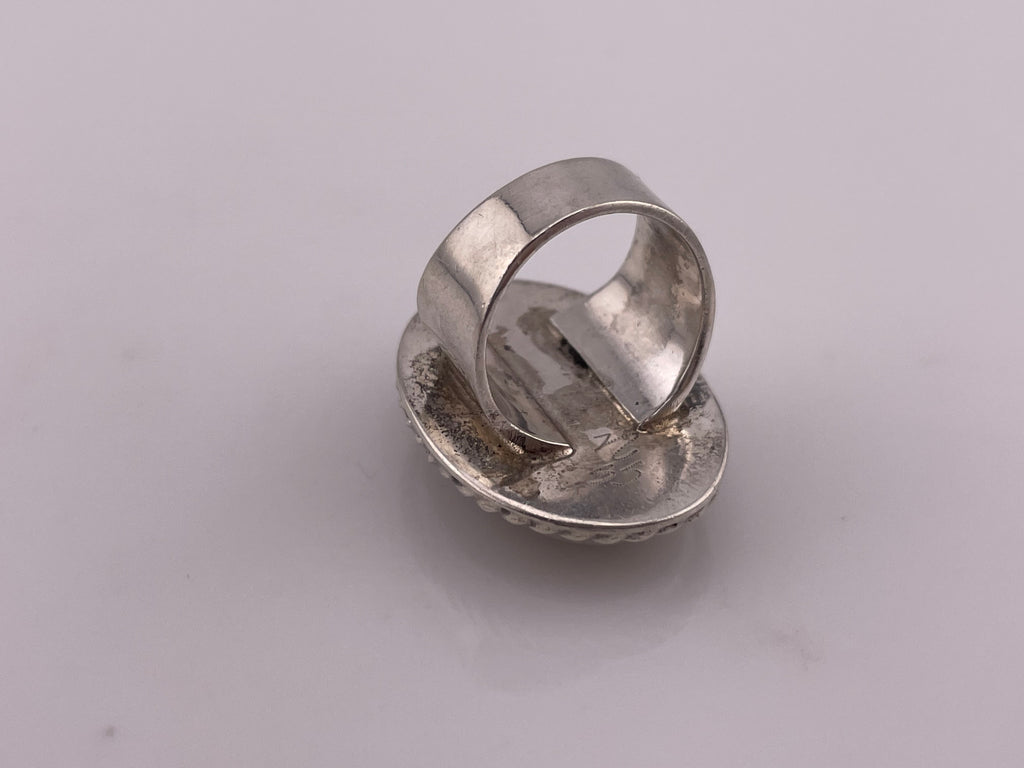 The silver is scratched from wear and storage, as is typical with pre-owned jewelry. This ring has tarnishing and patina that may not come off when polished. Please note, under the stone there is potentially glue causing a foil like appearance.