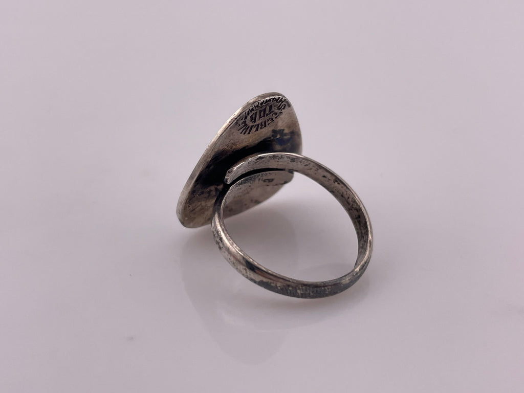 The silver is scratched from wear and storage, as is typical with pre-owned jewelry. This ring has tarnishing and patina that may not come off when polished.