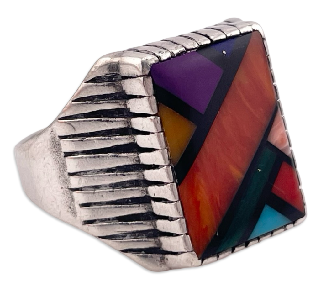 Stone used appear to be spiny oyster, malachite, rhodochrosite, coral, lapis, turquoise. The purple and orange "stones" appear to be synthetic and the black appears to be a resin.
