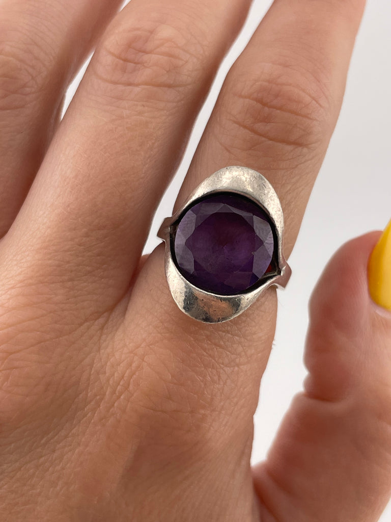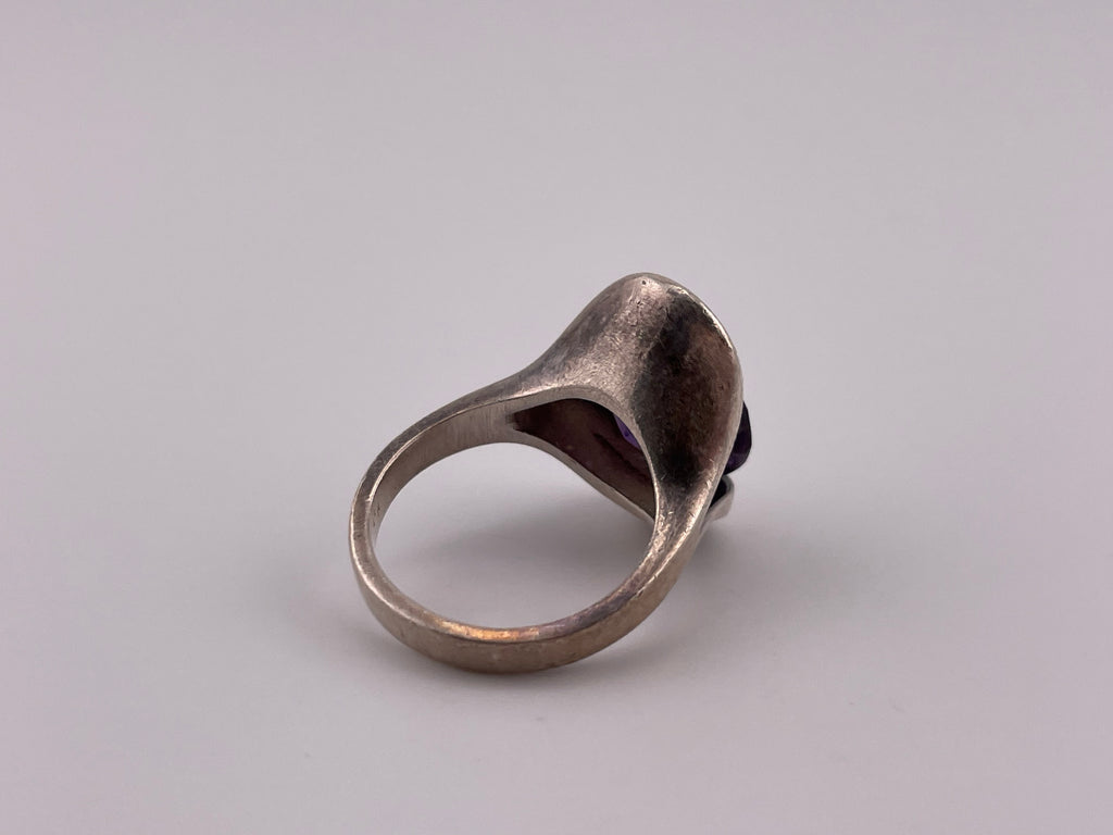 Sterling silver ring. Please note that there are some small chips to the glass. This glass looks mostly purple, but can change to a combination of blue and purple depending on the light.
