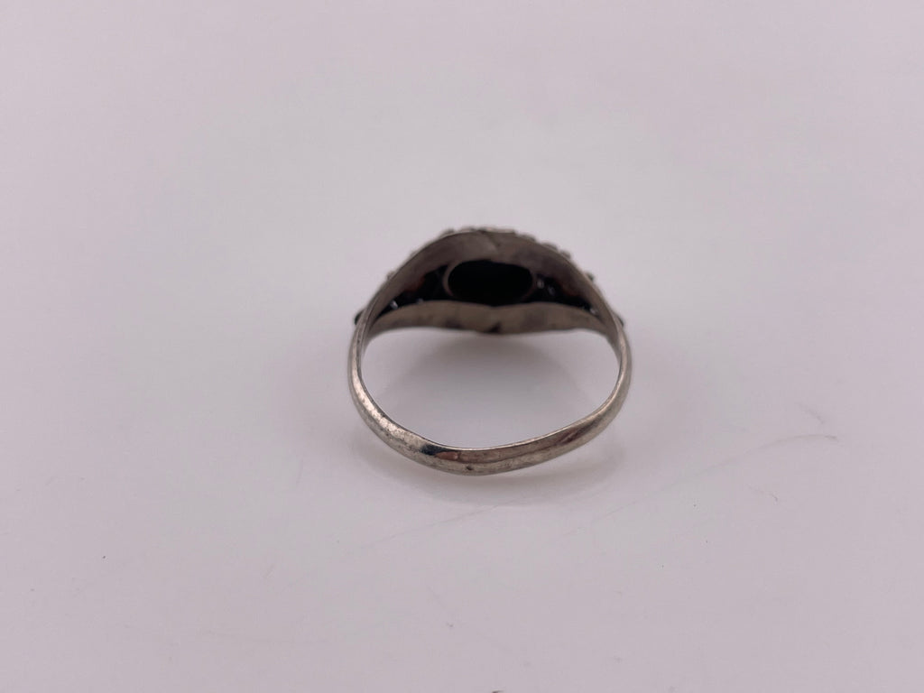 The silver is scratched from wear and storage, as is typical with pre-owned jewelry. This ring has tarnishing and patina that may not come off when polished.