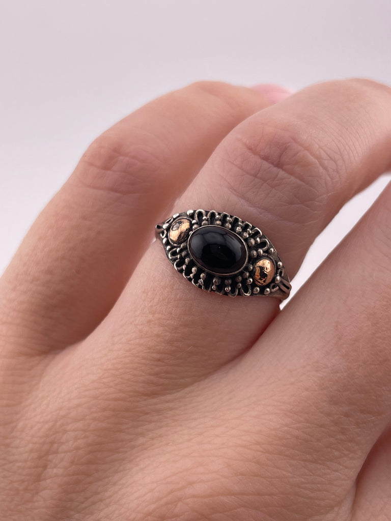 size 7.5 sterling silver black glass gold accent ring ***AS IS***