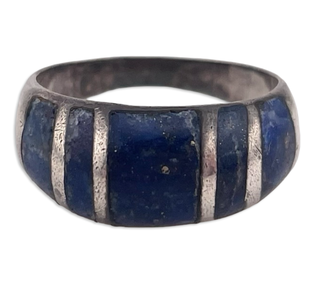 The silver is scratched from wear and storage, as is typical with pre-owned jewelry. This ring has tarnishing and patina that may not come off when polished. The sodalite is scuffed and has tiny chips from previous wear.