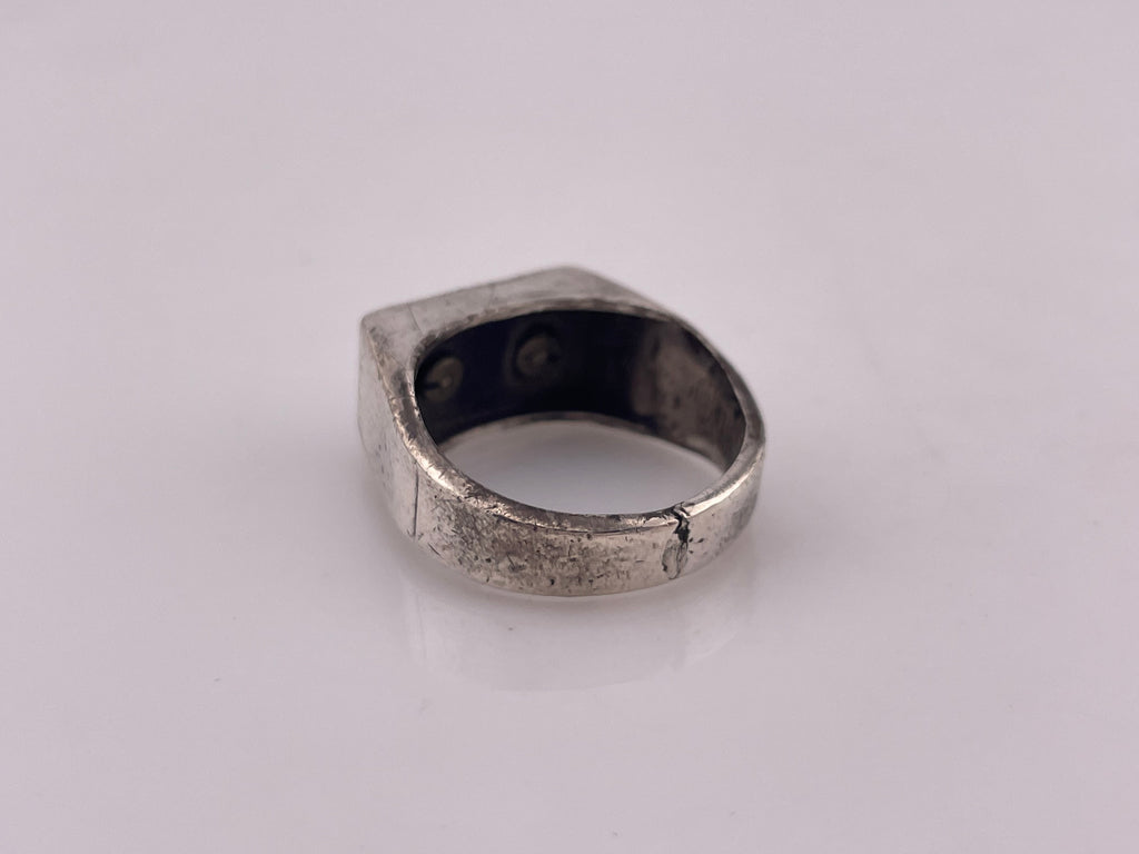 Please note, the silver is very scratched and dented from wear and storage, as is typical with pre-owned jewelry. This ring has tarnishing and patina that may not come off when polished.