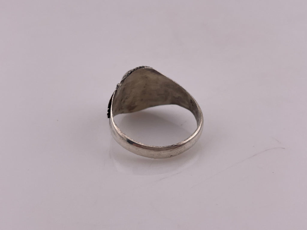The silver is scratched from wear and storage, as is typical with pre-owned jewelry. This ring has tarnishing and patina that may not come off when polished. There is a small dent on the gold wash detailing.