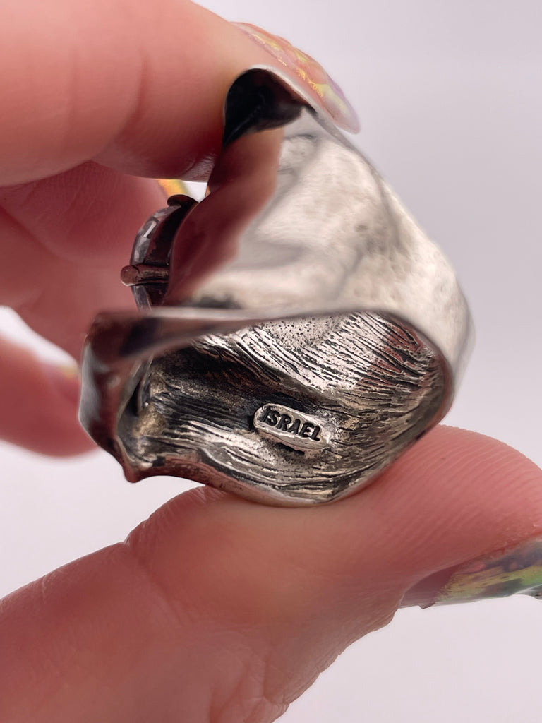 The silver is scratched from wear and storage, as is typical with pre-owned jewelry. This ring has tarnishing and patina that may not come off when polished.