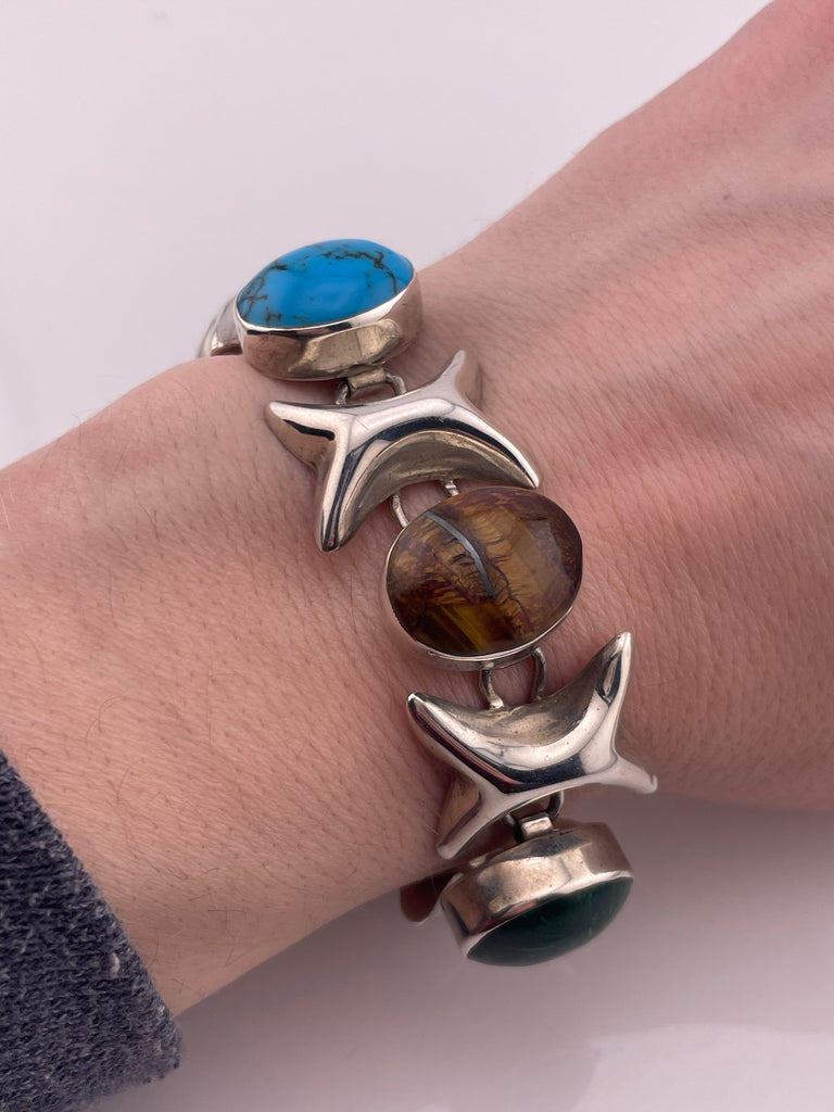sterling silver 7 1/4" Mexican heavy mutli-stone link bracelet