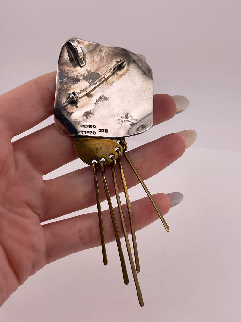 This pendant/brooch has scratches to the silver from previous wear, and tarnishing that may not come off when polished.