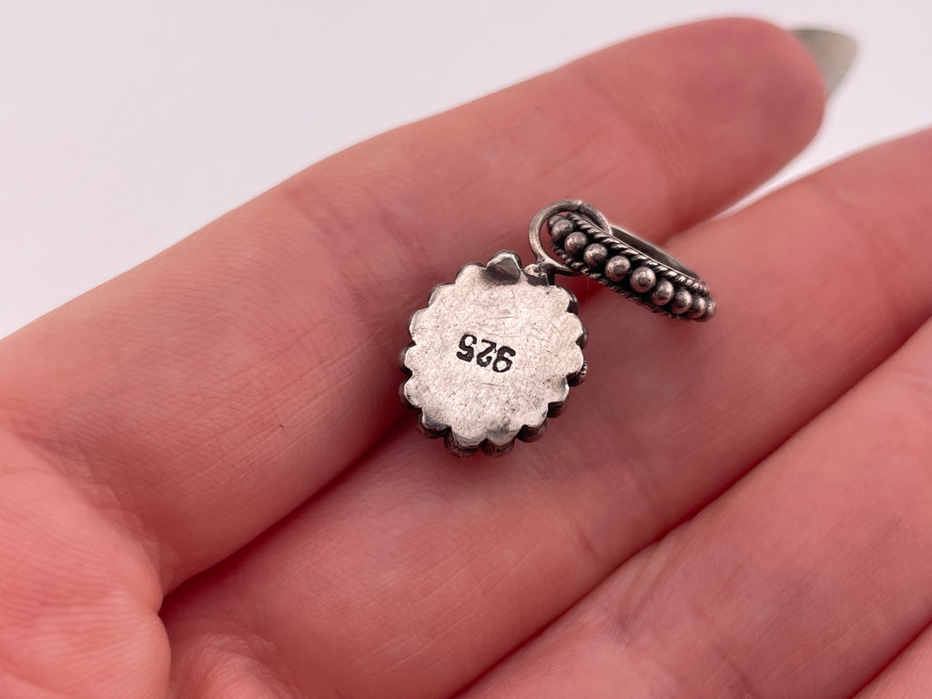 This pendant has scratches to the silver from previous wear, and tarnishing that may not come off when polished.