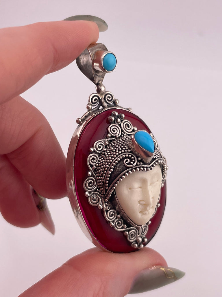 sterling silver synthetic coral turquoise molded plastic face pendant